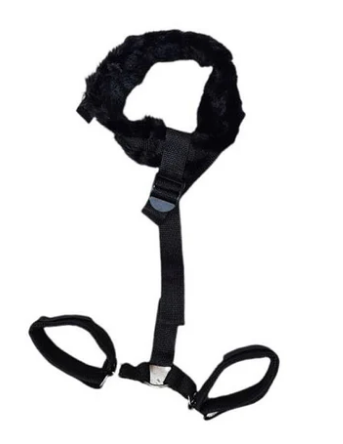 A coleira é feita de nylon resistente e possui uma tira regulável que desce pelas costas, permitindo que você alcance facilmente as algemas de mão. O ajuste personalizável garante um encaixe perfeito para uma experiência confortável e segura.