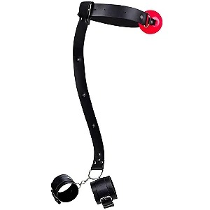 Kit contém uma mordaça bola e um par de algemas traseiras.