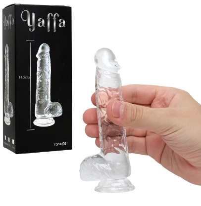 Um pênis transparente com escroto e ventosa, medindo 14,5x2,6cm, é um brinquedo sexual realista que oferece prazer visual e sensorial.
